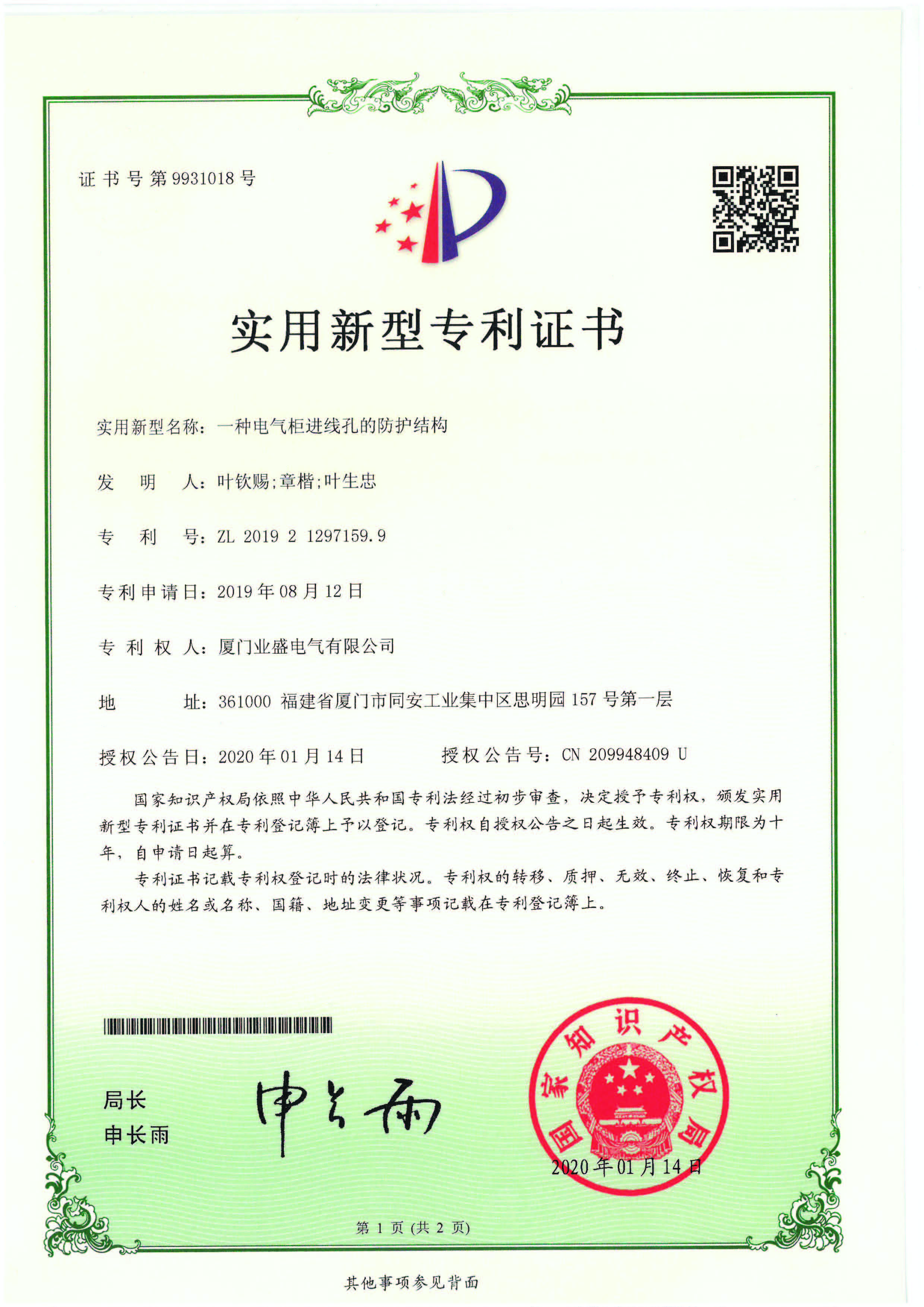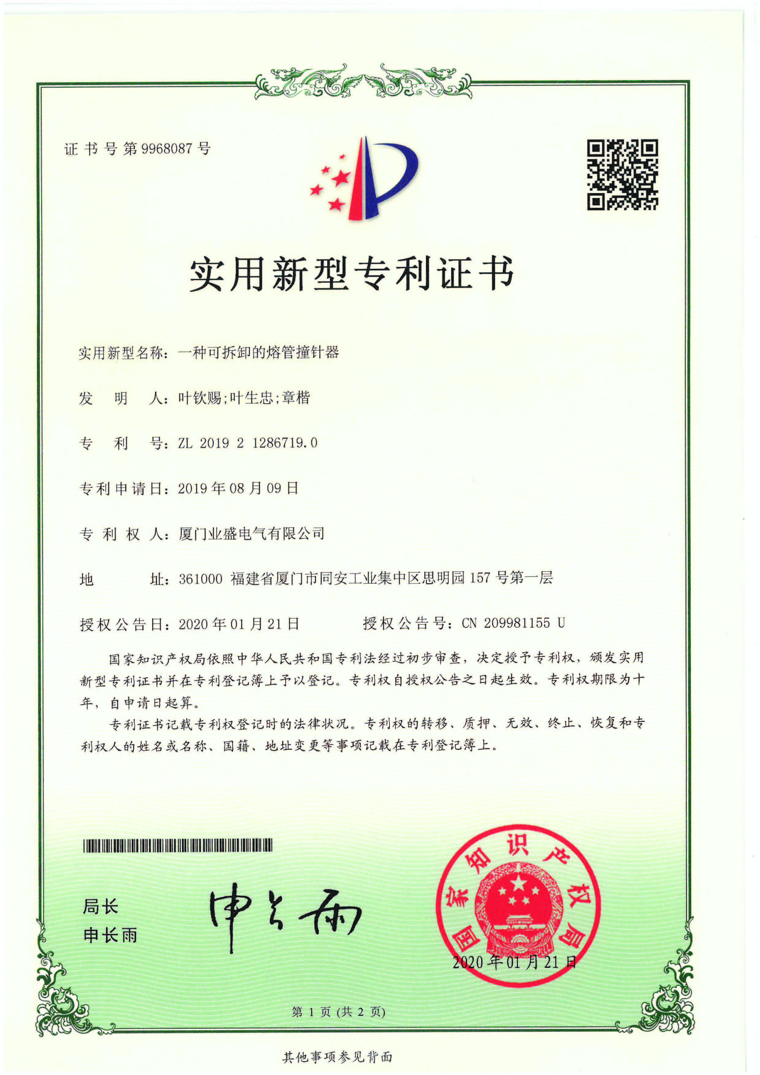 實用新型專利證書